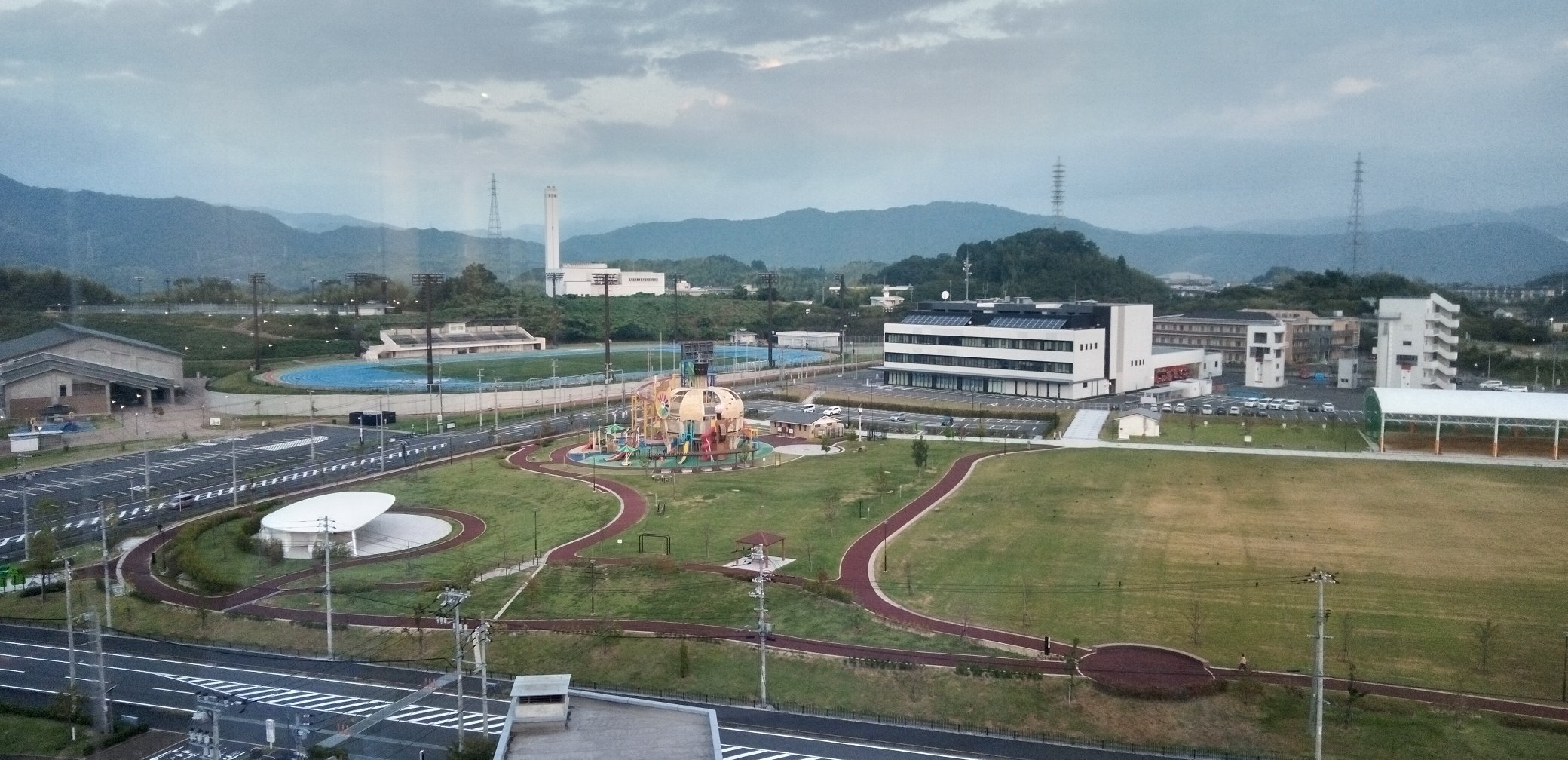 明る過ぎる「米軍の陸上競技場」と、暗く沈んだ「愛宕山ふくろう公園」。