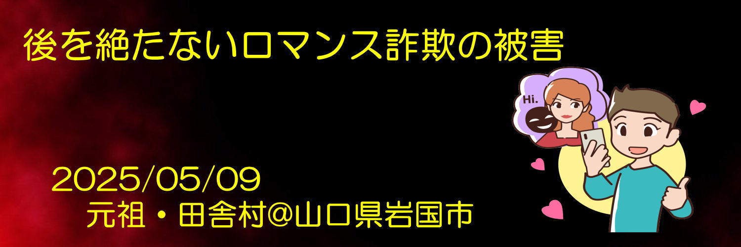 【後を絶たないロマンス詐欺の被害】山口県のニュースを見ていると、ロマンス詐欺の被害者が続出。一昔前、メルカリへの出品した商品の購入者から、甘い言葉を書き連ねたメッセージの攻撃にあったことがある。本気にしていたら尻の穴の毛を抜かれていたかもしれない。