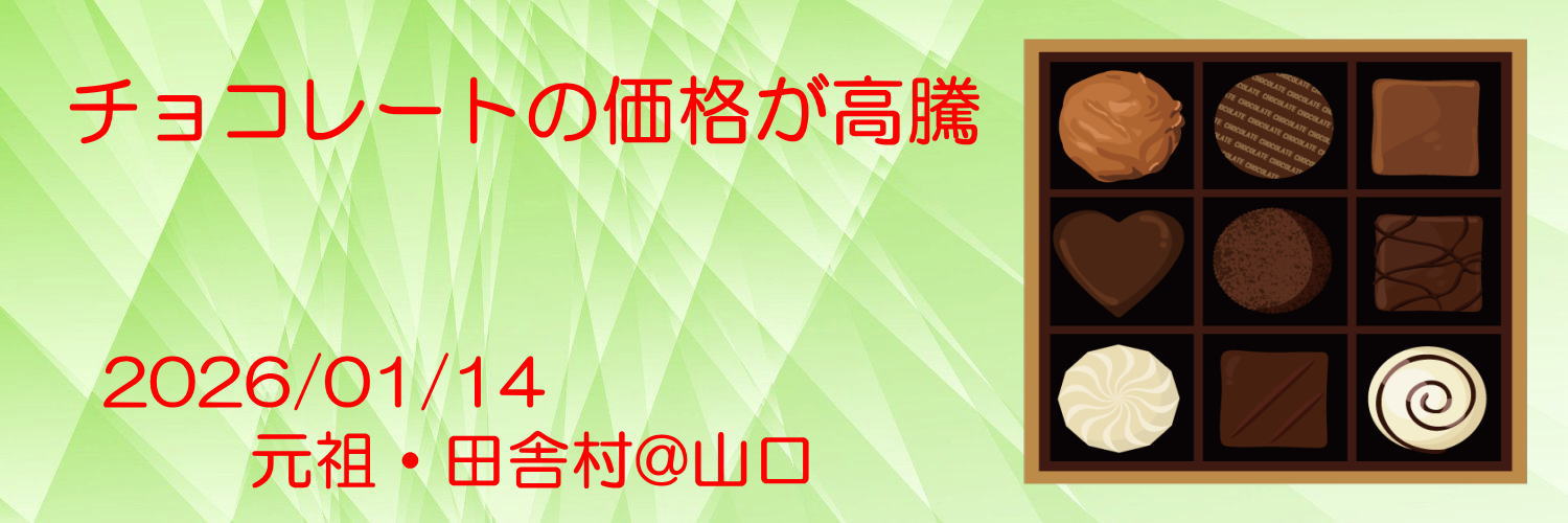 【チョコレートの価格が高騰】チョコレートの原料であるカカオ豆の高値により、バレンタイン商戦に影響があるとのニュース。チョコレートの価格高騰は確かであるが、我が家では商売人の手に乗らず、昨年末に価格が高騰していないベルギー製のチョコレートを5箱買いだめしておいた。