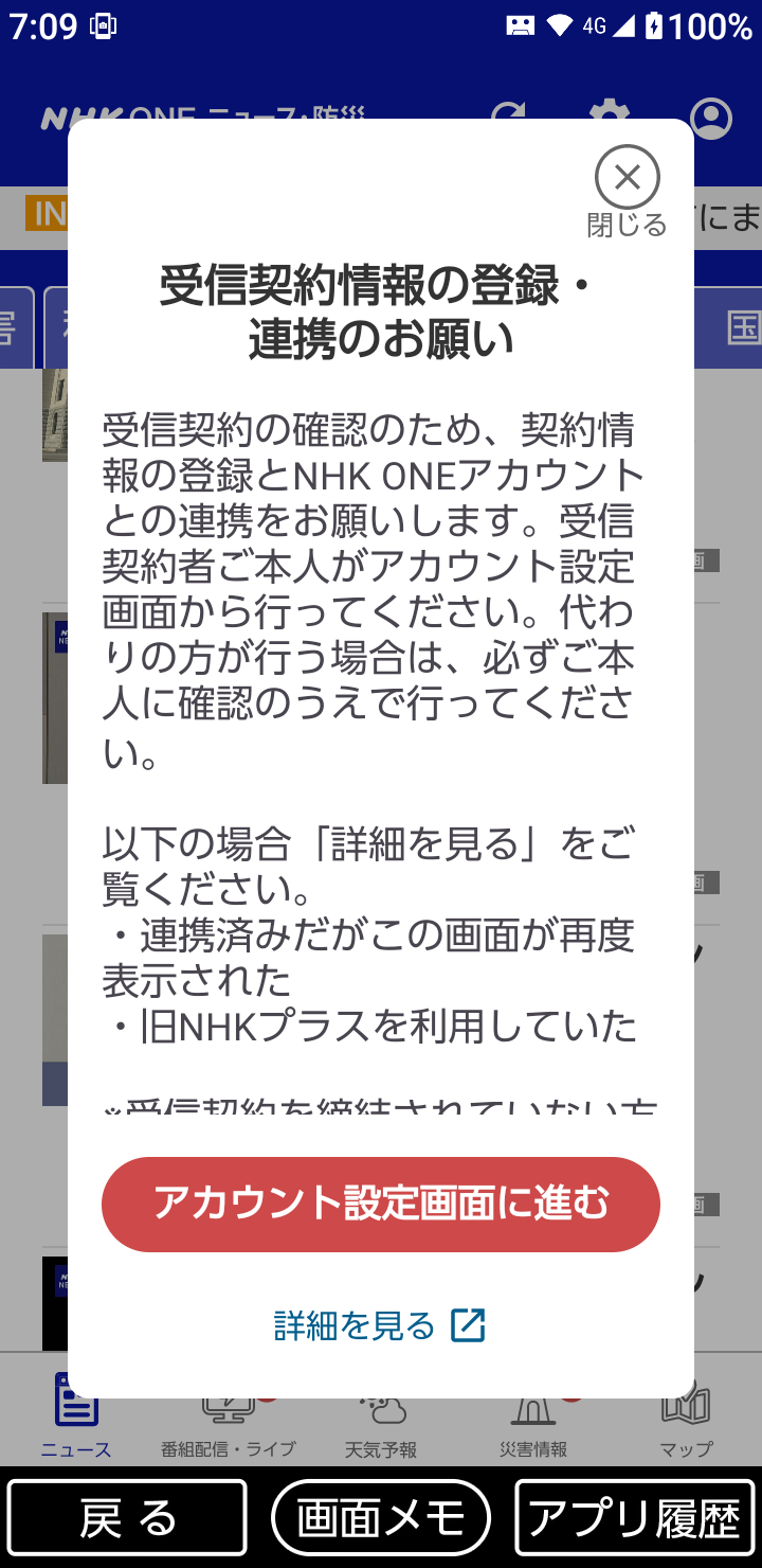 【緊急注意報・詐欺のようなNHK】14日の朝、「NHK ONEのニュース防災」を開いたら、またまた添付のような画面が表示された。受信契約については2025年12月9日に件名「受信契約の確認完了のお知らせ【NHK ONE】」のメールを受取済み。二重取りは許さないぞ!