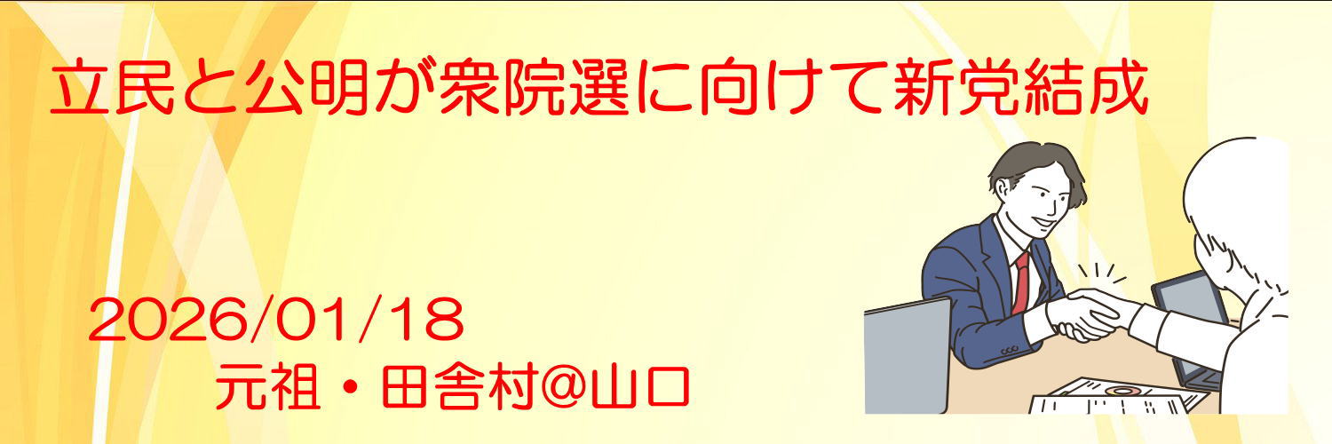 【立民と公明が衆院選に向けて新党結成】見掛け倒しで中国に対してダルマ状態の高市首相の衆院解散に対して、立民と公明が、まさかの新党「中道改革連合」結成。他の党が批判しているが、自民維新の連立政権も、他の新党の結成も、自分本位の選挙のためだけではないのか?
