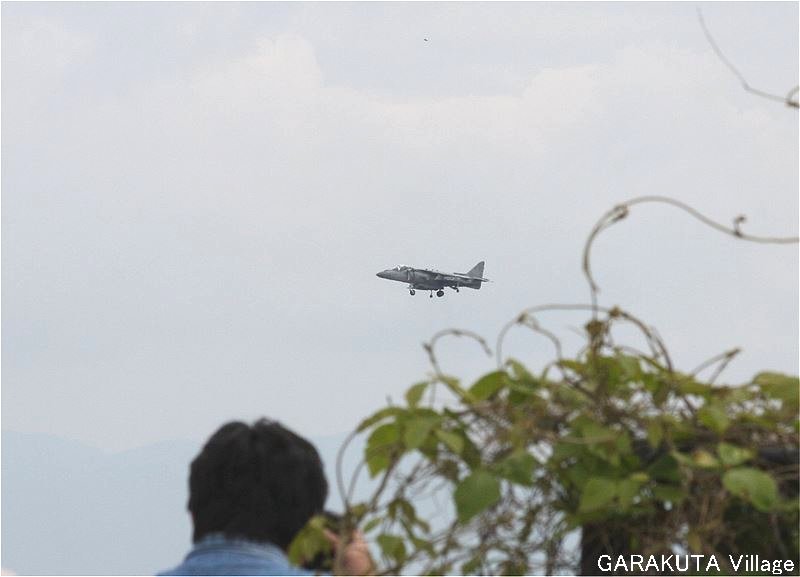 当日は有料席の前でのDEMOですから、滑走路の端付近の広場からでは遠すぎますが、黒煙を下に噴出しての垂直離着陸は小さいながらも楽しめます。