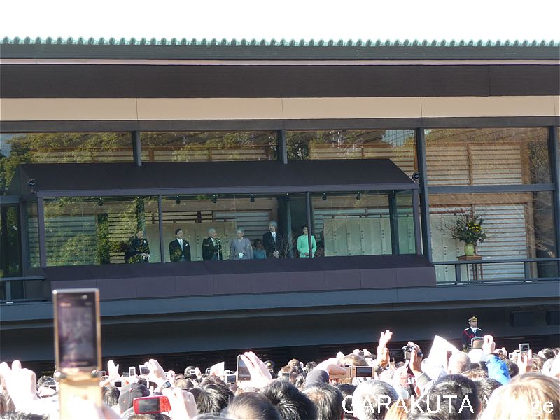 私はカメラを持った手を上に上げて写真を撮り、前の外国人の頭の間から天皇皇后両陛下、皇太子同妃両殿下、秋篠宮同妃両殿下をチラッと見ることが出来ました。
