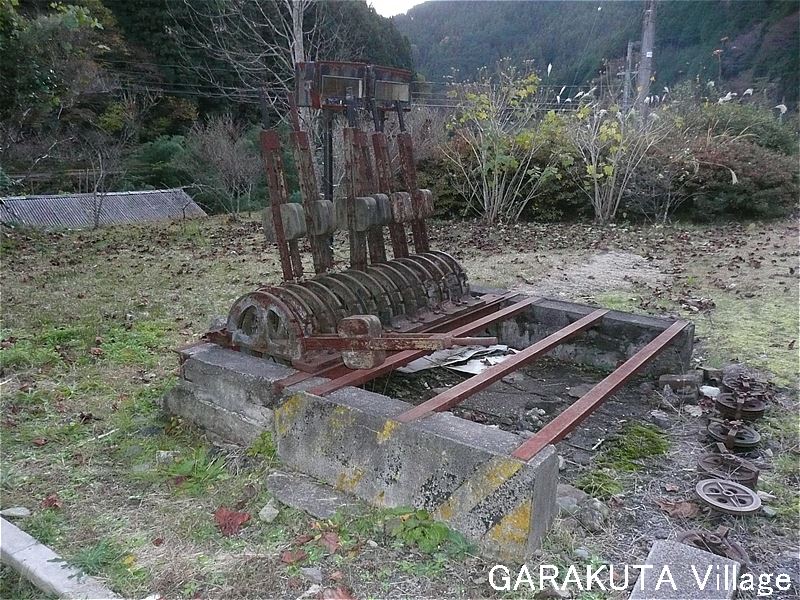 下の写真は、引込み線のポイントの切替装置です。人力の手動式で、ワイヤーロープが掛かっていた輪が残っています。