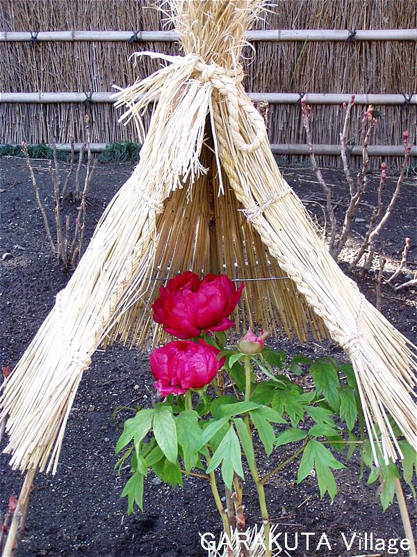 寒い冬の2月、鎌倉の鶴岡八幡宮の境内を回っていたら藁の風除けを発見。何かなと覗いてみたら、寒牡丹でした。寒牡丹の赤色は鮮やかですね。